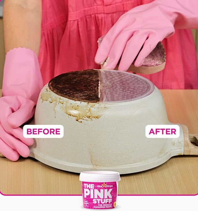 The Pink Stuff Miracle Cleaning Paste is perfect for cleaning dirt, grime, and stains on saucepans, cooker tops, sinks, uPVC, barbecues, ceramic tiles, glass, showers, garden furniture, paintwork, boats, brass, and rust. The list is endless.