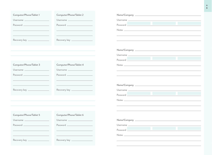 Gone are the days of scribbling these essential details on sticky notes that get lost or thrown away! The cut-away alphabetical tabs make the recorded information easy to find. Plus, you’ll find quick tips for creating strong passwords and keeping your information safe online.