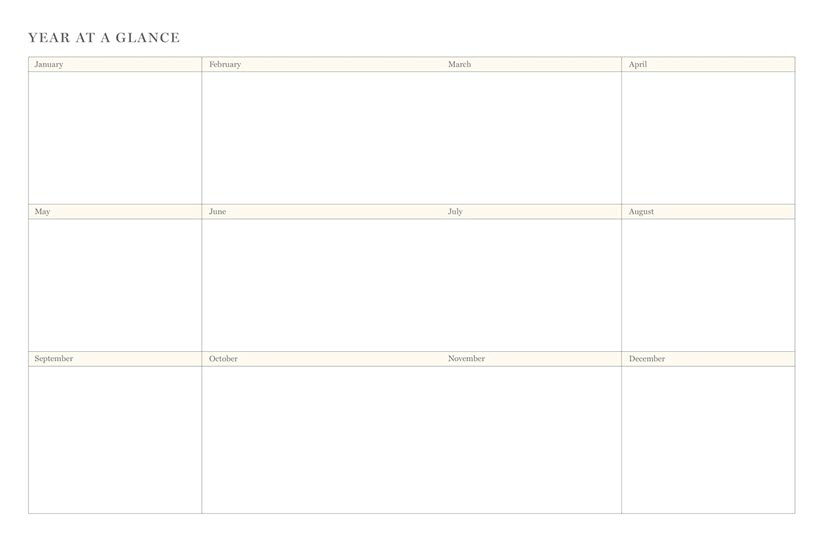 - Year-at-a-glance pages and a lined page for additional notes