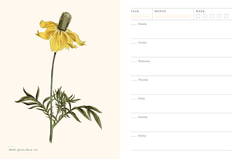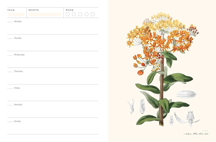 This attractive planner offers weekly pages where you write in the year, month, and day, making your daily planning a breeze. Each page accentuates its beauty with a lush botanical illustration of a North American native plant, sourced from historical archives and dating from the early 1700s to the mid-1900s.
