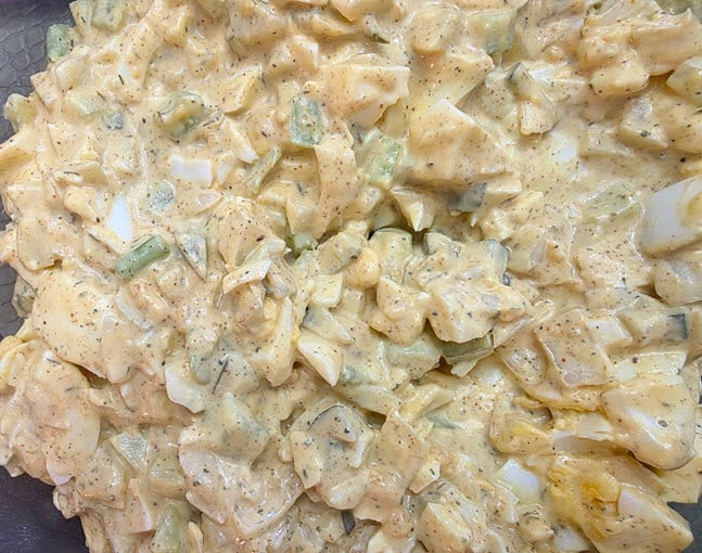 them into the dressing with the onion, pickles, and spices. - Cover and refrigerate the egg