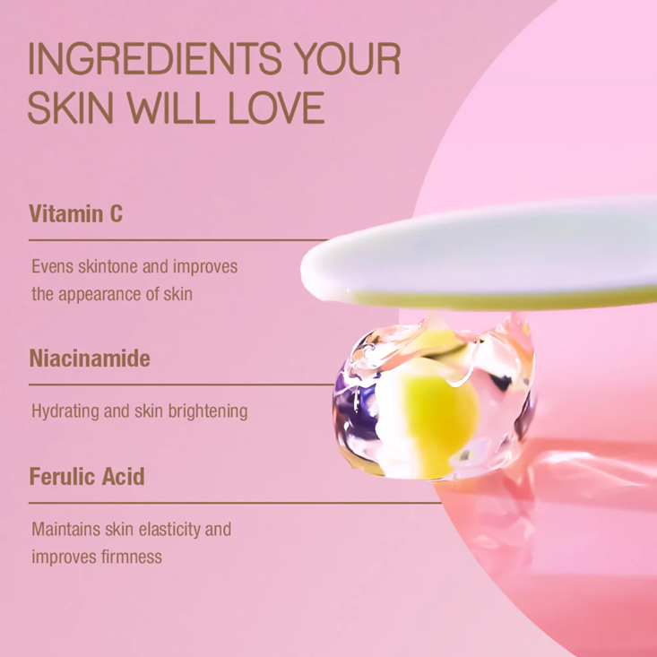 Vitamin C helps even skin tone and improve the appearance of dark spots, Niacinamide hydrates and enhances radiance, and Ferulic Acid supports skin elasticity — three powerhouse actives working together in one formula.