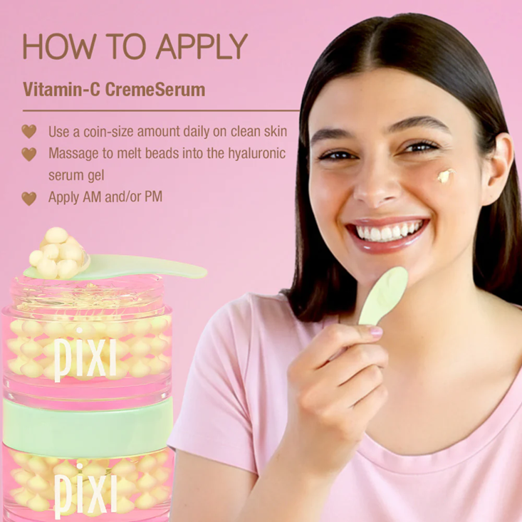 Pixi Beauty Vitamin-C Crème Serum contains encapsulated Vitamin C Technology, delivering deep hydration with the lightweight feel of a serum and the moisture-locking comfort of a cream, absorbing quickly without greasy residue.