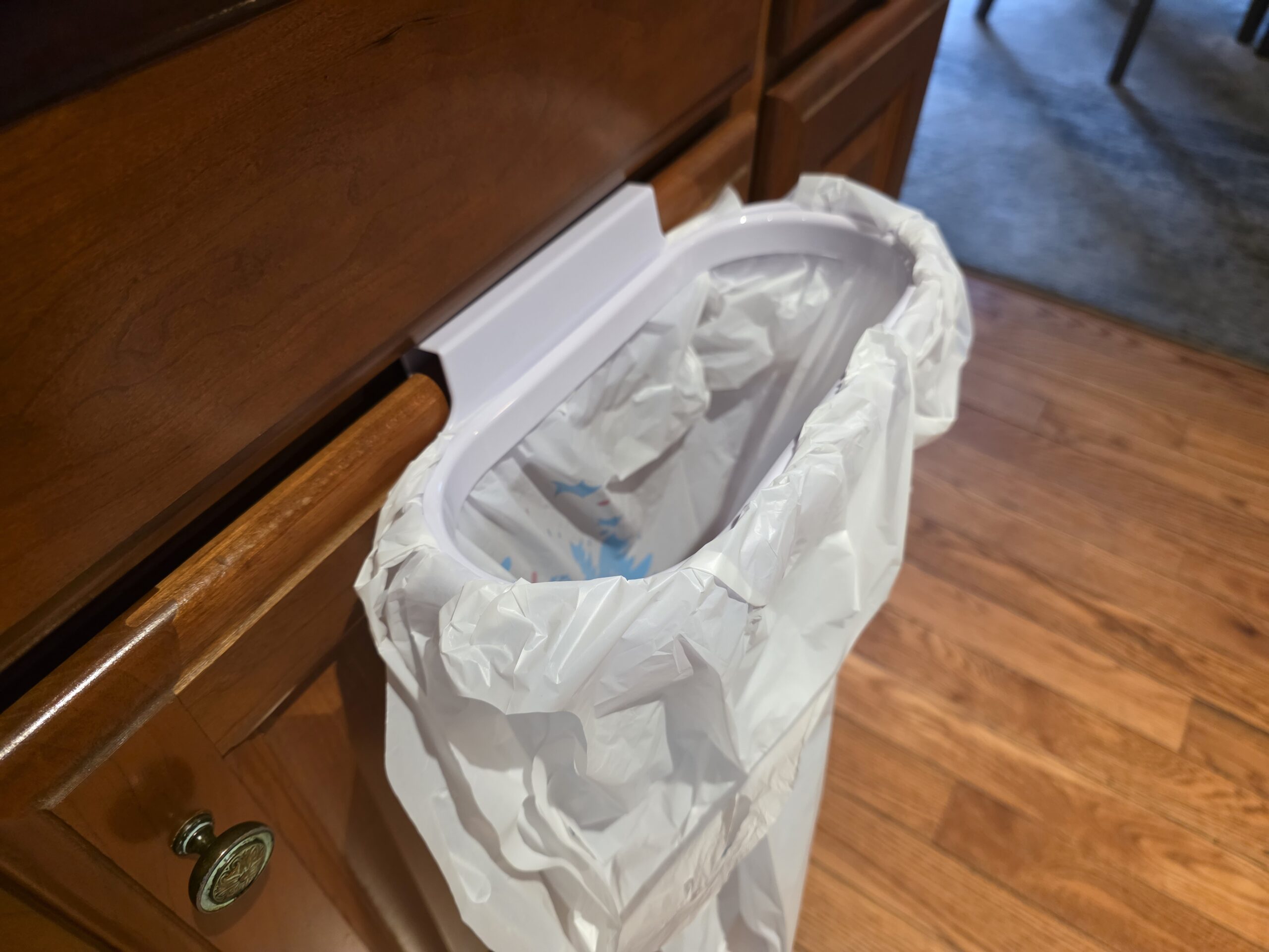 I wanted to add this last item to our product roundup because it’s been a game-changer for my kitchen. This over-the-cabinet plastic trash bag holder is inexpensive and makes life much easier. Now I can easily place my trash into this holder and not have to walk back and forth to the garbage can constantly.