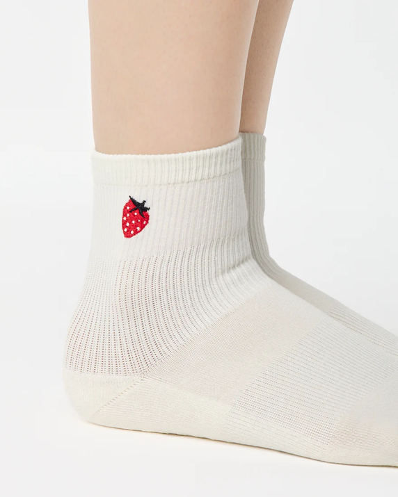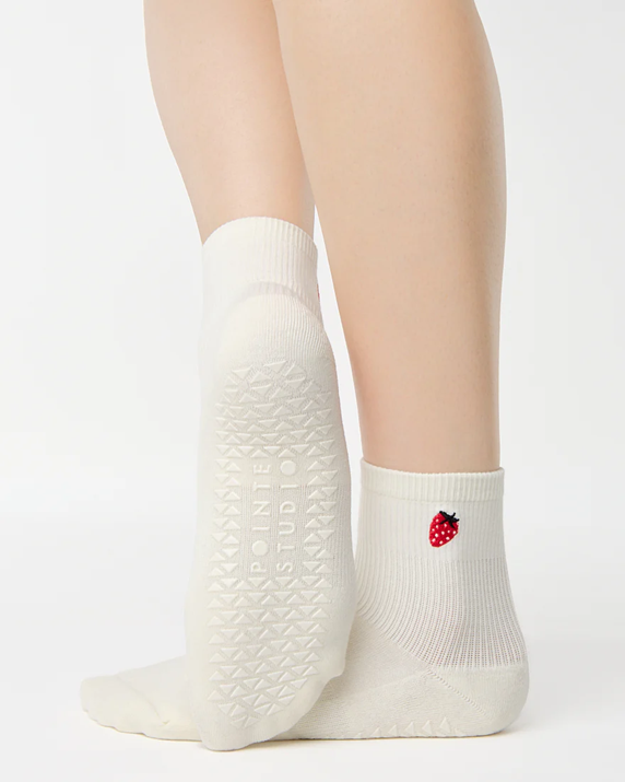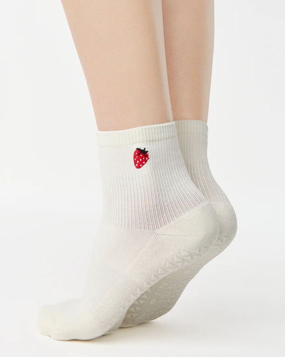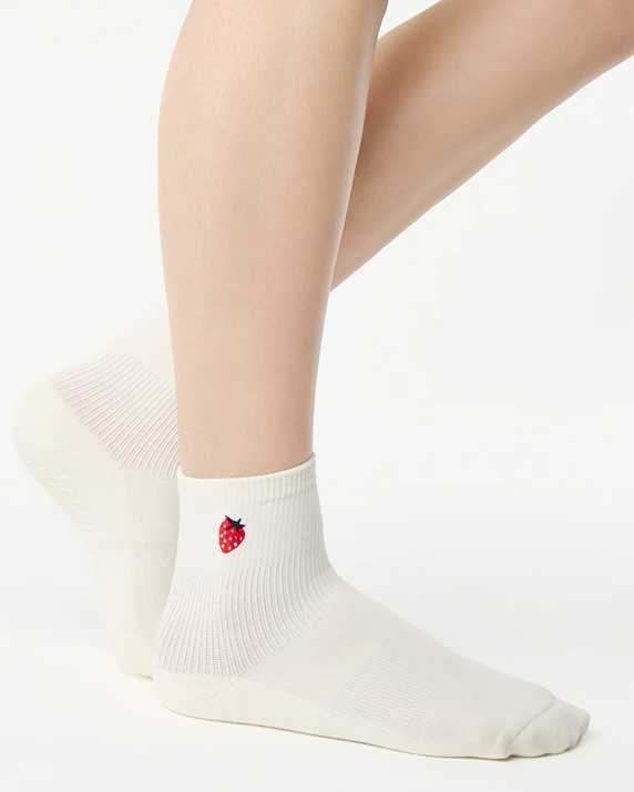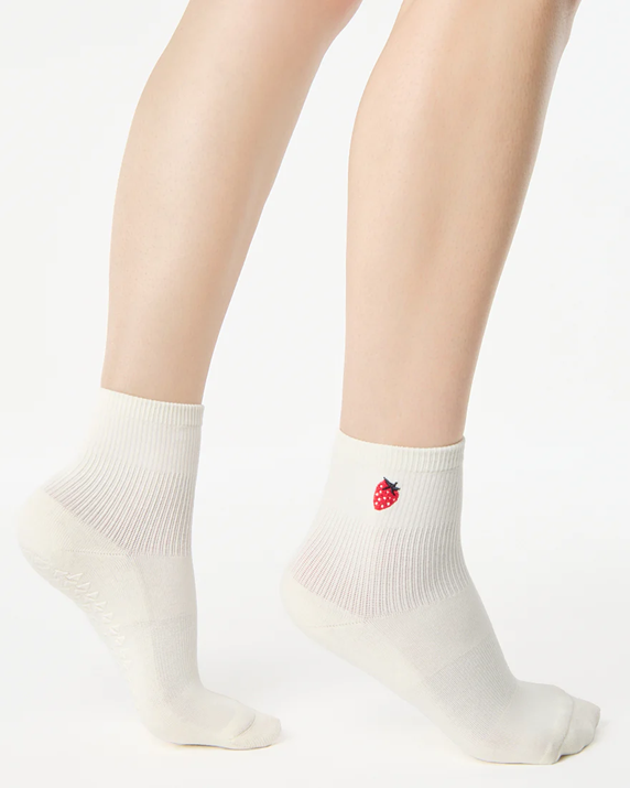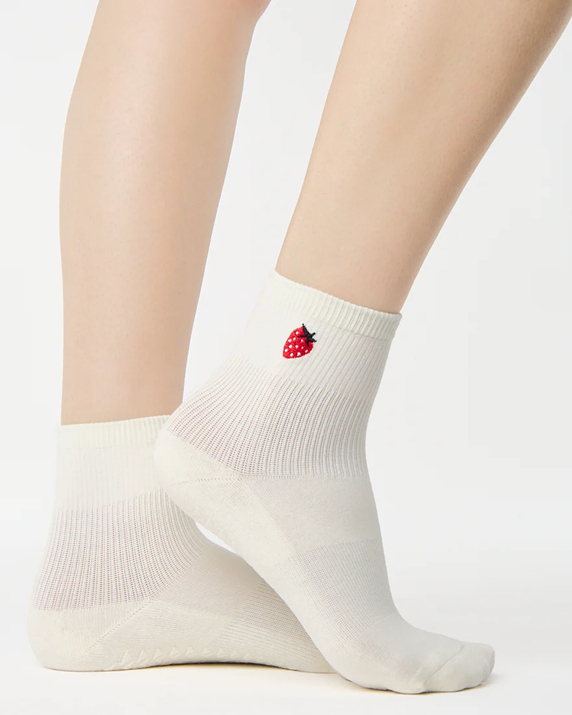 Now, you can freshen up your routine in the Strawberry Grip Ankle, a solid minimal design with a bold strawberry embroidery on the outside of the sock.