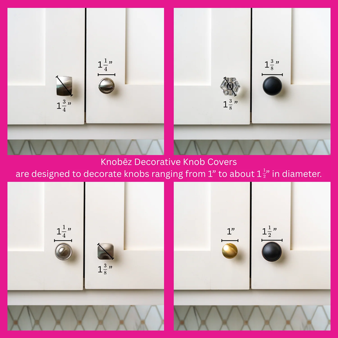 - Knobēz are designed to work with a variety of different styles and sizes of hardware ranging from 1″ to about 1 1/2″ in diameter. *If measuring for a square knob, measure from corner to corner diagonally.