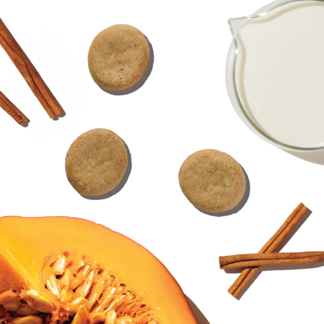 The ingredients are simple and natural: goat’s milk, barley, rolled oats, tapioca, honey, pumpkin, organic coconut oil, cinnamon, vanilla, mixed tocopherols (a natural preservative), and dried Bacillus coagulans fermentation product.