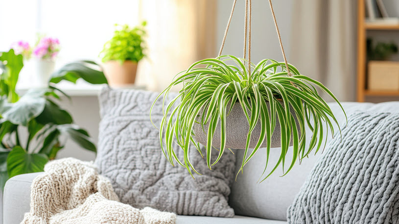 The long, arching leaves of the spider plant are great for passively collecting dust. Its easy-to-care-for nature and ability to grow in a hanging basket make it a versatile choice.