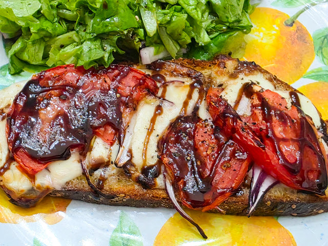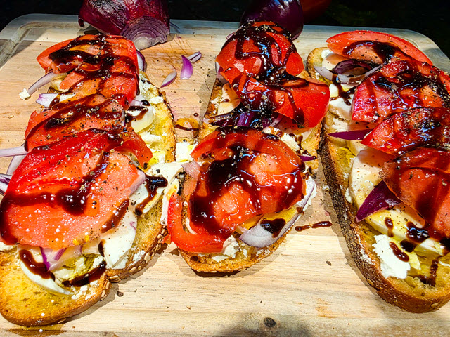 The dish is so delicious because each component provides a different but harmonious texture and flavor, from the crunchy toast to the juicy tomatoes and the tangy-sweet drizzle of balsamic glaze, creating a refreshing and satisfying bite that is greater than the sum of its parts.