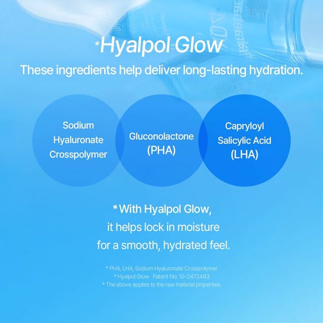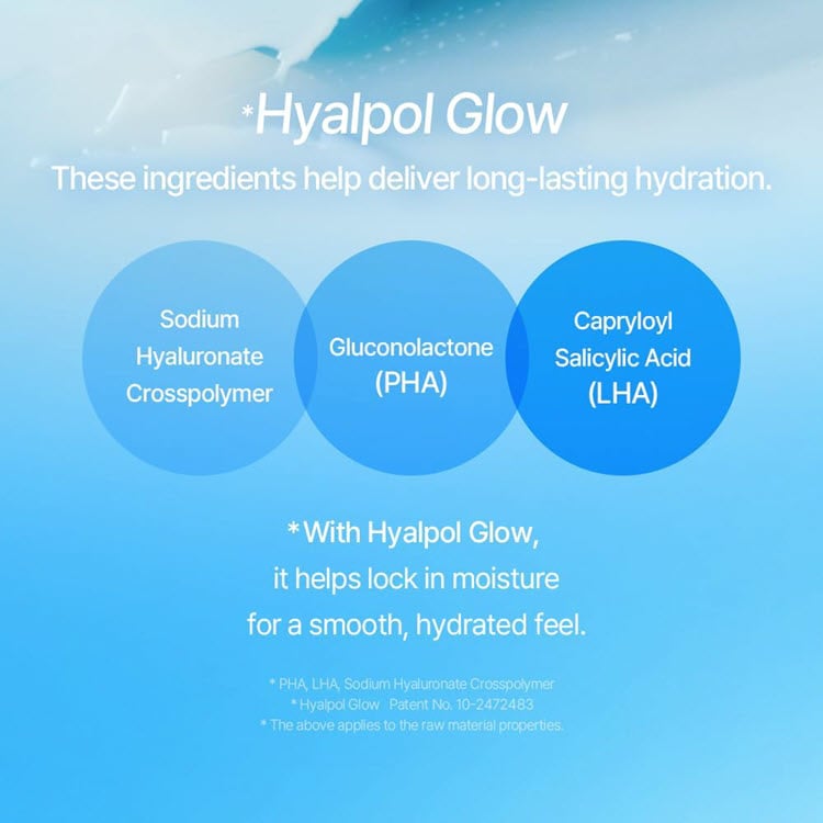 Hyalpol Glow Complex (PHA + LHA + Sodium Hyaluronate Crosspolymer) – A gentle-renewal complex that smooths skin texture, enhances radiance, and locks in deep hydration without irritation.